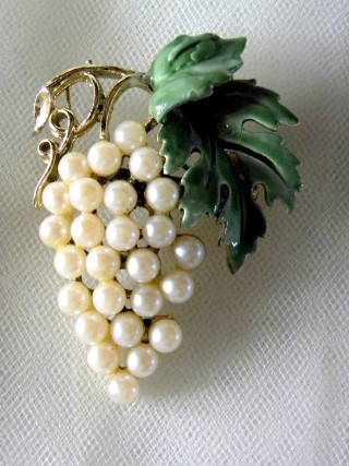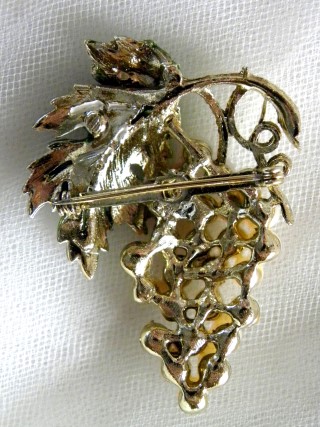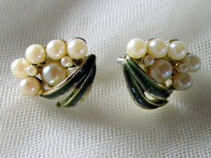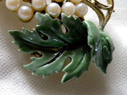 Goldtone Grape Cluster Brooch - 26 Faux Pearls & green enameled leaves on brooch – 8 Faux Pearls & green enameled leaves on each earring - well-made piece - high quality faux pearls are bezel set and the color on the enameled leaves is rich and carefully applied - brooch approx. 2 ½ " x 1 ½” – earring approx. ½ “ x ½ “ - excellent condition - inconclusive makers marks