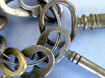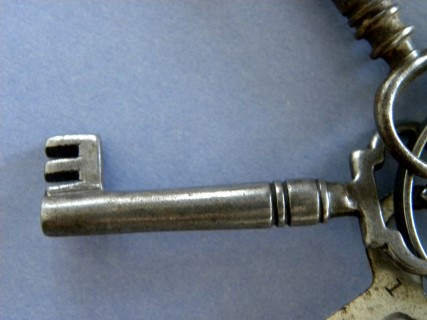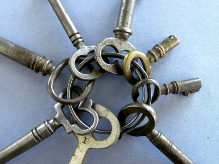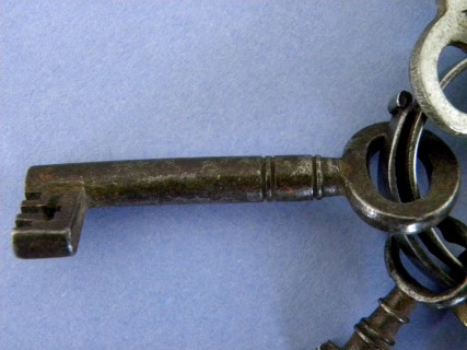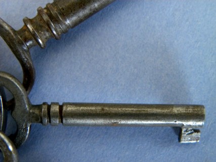 Great set of 8 old hollow barrel & skeleton keys – steel, brass and wrought iron – 1” to 3” – original iron coil key ring.