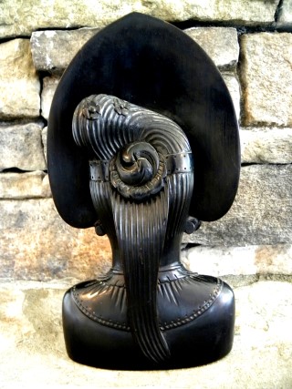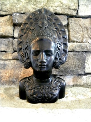 Bust of an Indonesian woman, head and shoulder Bust with intricate carvings front and back - Balinese hardwood bust portrait, the elegant beauty carved with an elaborate floral-accented head dress and collar w/ large earrings framing her serene face – CIRCA 1940S - EXCELLENT CONDITION