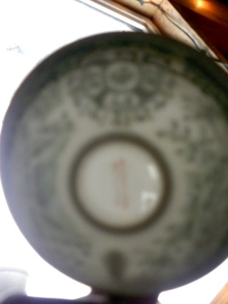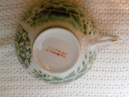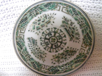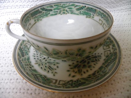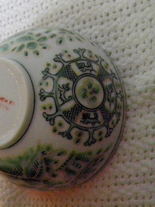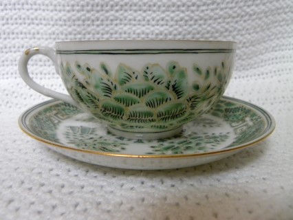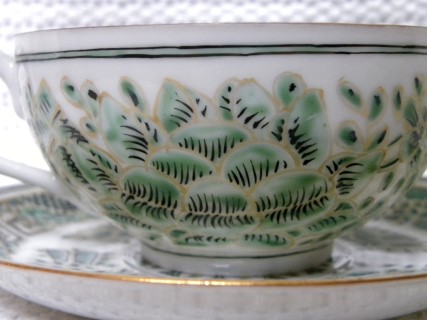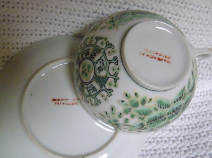 Matching set of 5 porcelain teacups and saucers - Hand decorated in Hong Kong with brilliant colors of teal, yellow, and coal black w/ matching inside wreath – gold gilt edges on cup & saucer rims - delicate porcelain is the finest – translucent when held to the light - Decorated in Hong Kong - Cup approx. 1-7/8” tall, 4 7/8" across - Saucer is 5-3/8" wide - excellent condition with no damage of any kind & minimal signs of us - slight wear on some of the tea cup gilt but none on the saucer rims.