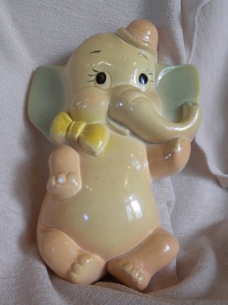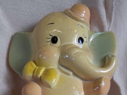 A darling chalkware elephant plaque, ready for baby's room or toy room - brightly hand painted in peach, pink & blue pastel - black accents - pieces were very popular during the 1920's to 1940's and made comebacks in later decades - good vintage condition with some paint crazing typical of ceramics of this age. Measurements: - 5 1/4" x 8" - hanging loop on back
