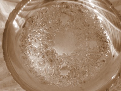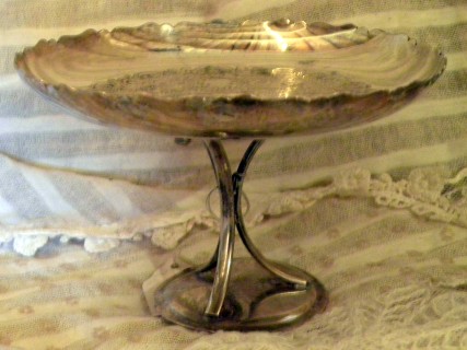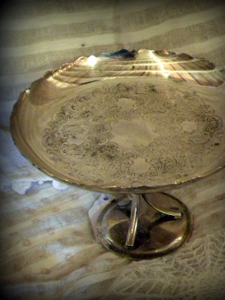 Silver plated cake/candy stand with an ornate pattern engraved on the top - patina of slight tarnish to add to its charm – there are age spots and the plate is at about a 20% lose on the base. The edge has a scalloped pattern with high quality engraving. It is approximately 12" across and 8" high.- Old yet still very sweet!