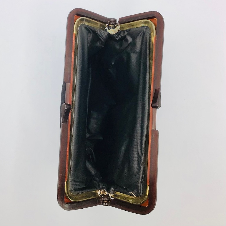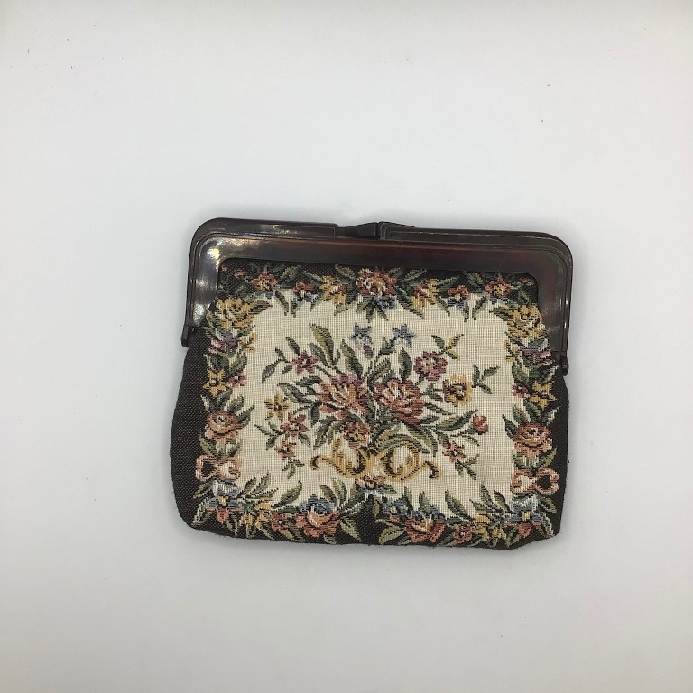 Vintage tapestry purse - measures approx. 7.25 x 6 inches - Bakelite bracket & clasp is tight but in perfect working order- lining in great condition - 3 fine scrattches on reverse side of Bakelite bracket (indicated in final photo) - Plum, and Rose Pink Flowers with Green Leaves - Plain black fabric on the back. Items are sold in "As is/As Found" condition