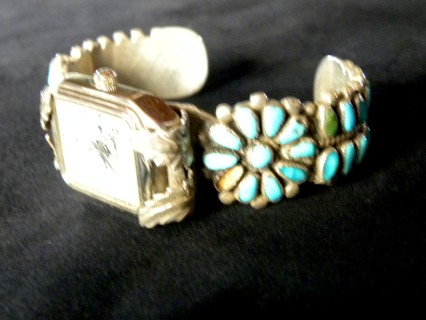This heavy sterling silver Forty year old petite point and snake eye turquoise cluster watch bracelet is Navajo designed and handmade. This is from Old Pawn; has 47 stone - as is missing one stone and one with a small chip (shown in photo) - "SelecTime" Watch - Band Signed “BB” - Very Old - "End of the Trail" Motif - stones measure approx. 1” tall by 7/8” wide - watch bracelet fits a 9” wrist. It has a 1.5” opening.