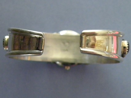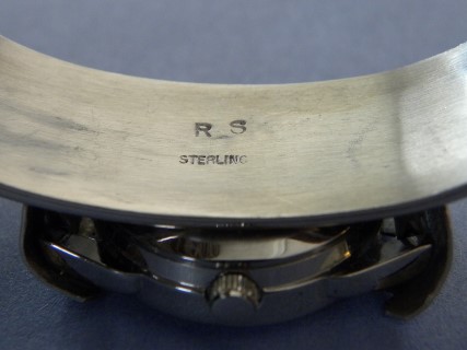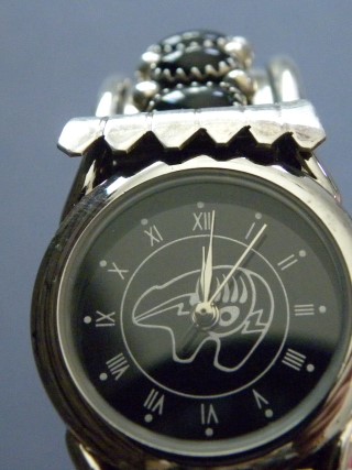 Watch has a black face with a silver outline featuring the bear & paw - 10 beselled onyx Cabochons - numbers are in Roman Numerals - - signed R.S. - Approx. 6" Inside Circumference + 1.5" Opening 7.5" Wrist Size x 1.25" Wide