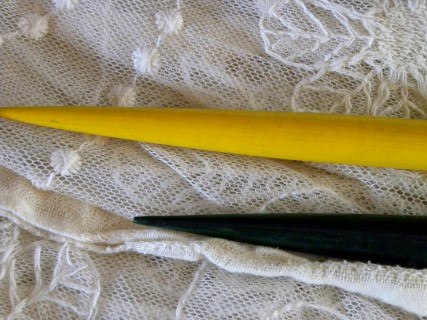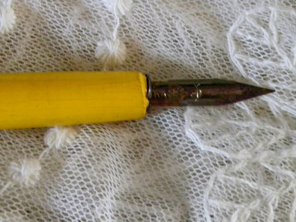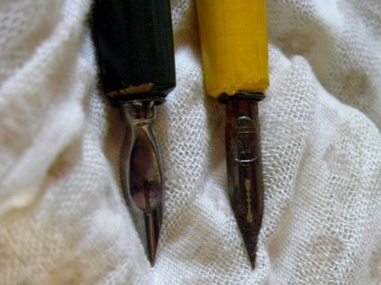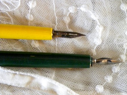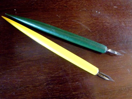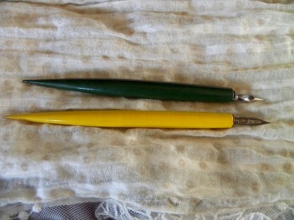The pens are made of wood - measure between about 8 and 9 inches in length – painted one green & one yellow – mint condition