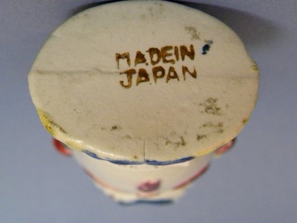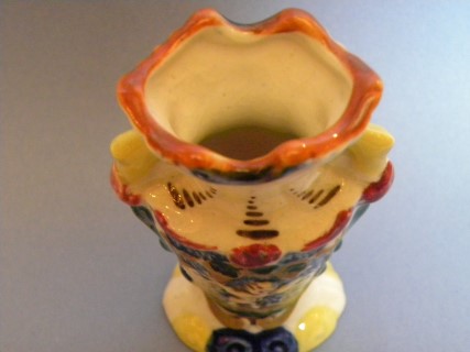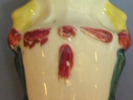 Cream colored w/ green burgundy yellow & blue trim around the handles and base - cherubs on one side - no cracks or chips – mild crazing.