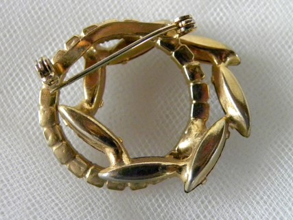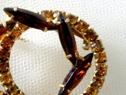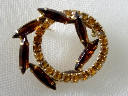 Circa 1960s round brooch - good quality citrine rhinestones & mahogany marquis stones all prong set - riveted construction and fastens with a safety rollover clasp.