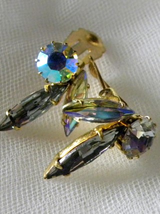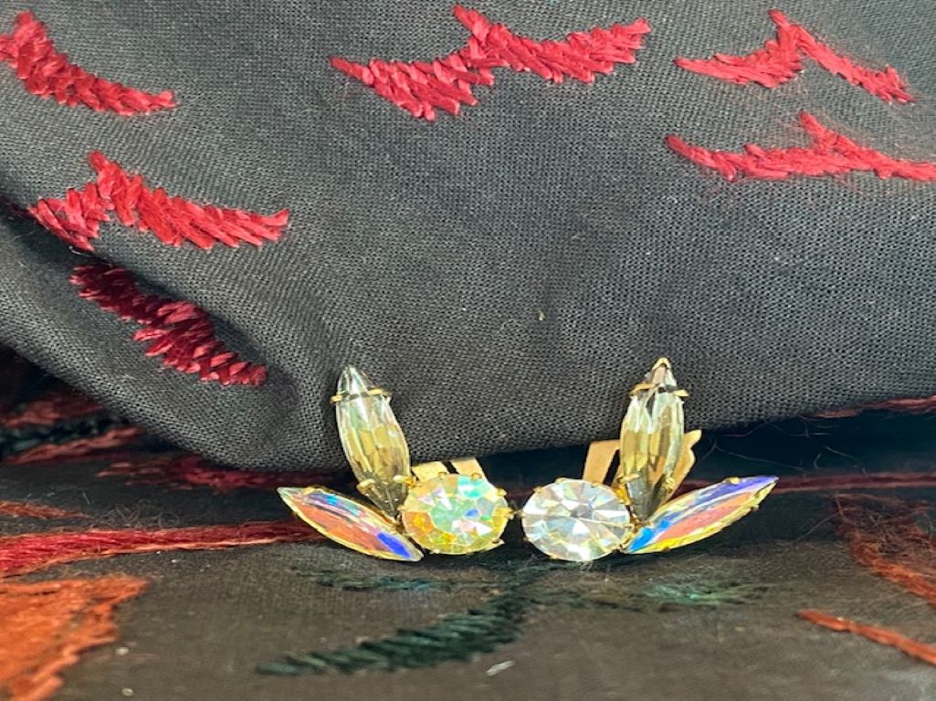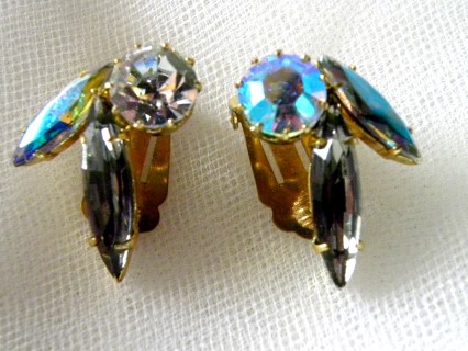 Vintage Aurora Borealis Rainbow Iridescent AB Rhinestone Clip On Earrings 1" x 1/2"